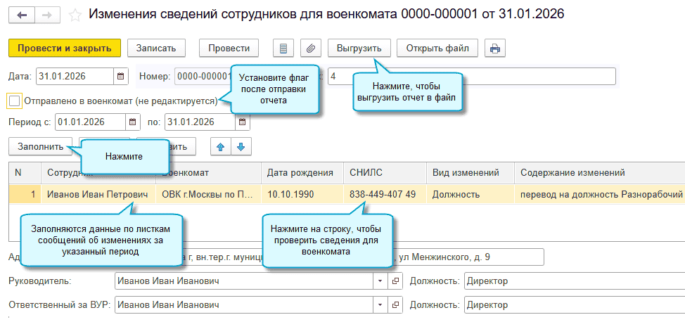- Изменения сведений сотрудников для военкомата,