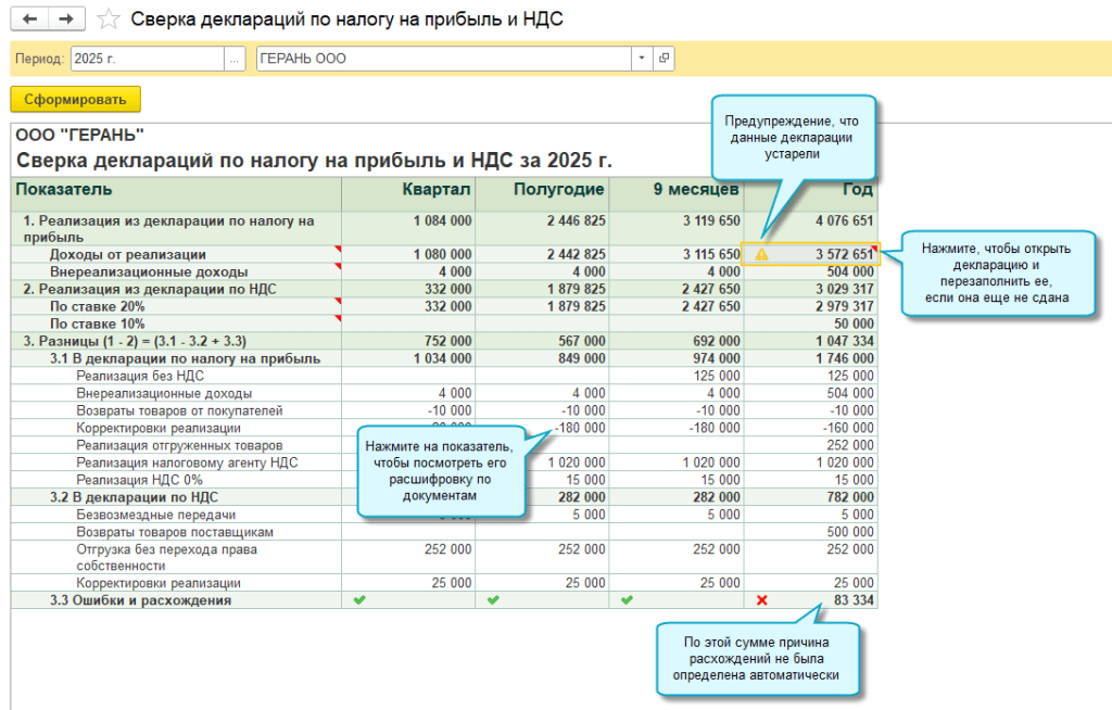 В «1С:Бухгалтерии 8» начиная с версии 3.0.195 доступен инструмент, который детально сверяет показатели выручки от реализации (доходов), отраженные в декларациях по налогу на прибыль и по НДС, и выводит причину расхождений (рис. 7).