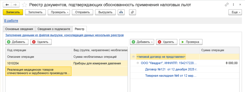 В «1С:Бухгалтерии 8» автоматизировано заполнение электронного реестра документов, подтверждающих право налогоплательщика на налоговые льготы по НДС (рис. 6).