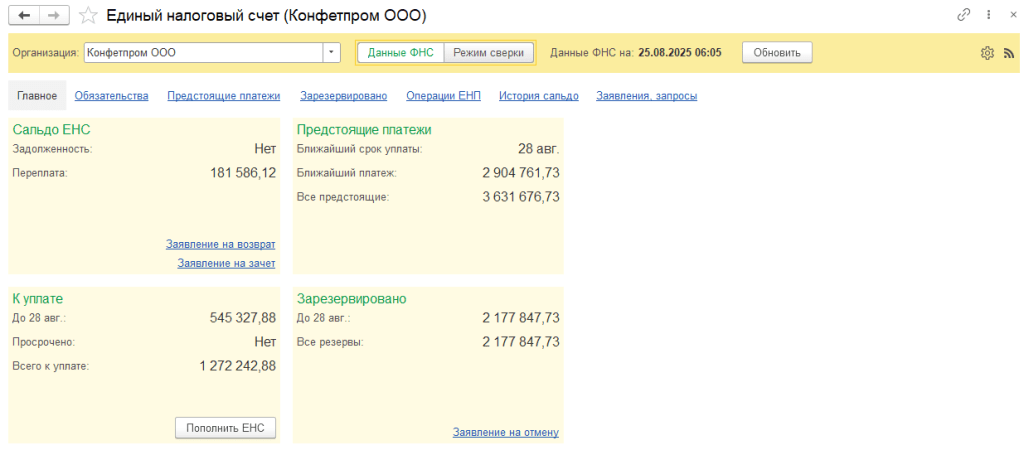 Сальдо ЕНС выводится в разделе Главное. Отсюда же можно распорядиться положительным сальдо ЕНС (вернуть на расчетный счет или зачесть в счет уплаты других налогов), сформировав соответствующее заявление. По кнопке Пополнить ЕНС можно сразу же сформировать платежное поручение на уплату ЕНП. Сверить сальдо ЕНС по данным ФНС и по данным учета можно, переключившись в режим сверки с ФНС.