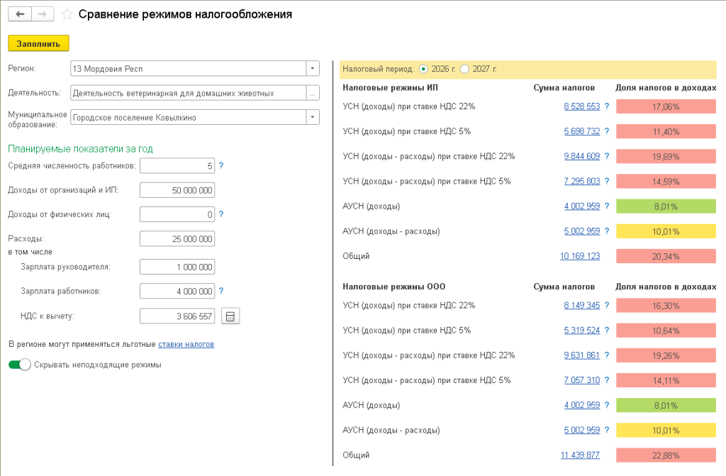 В «1С:Бухгалтерии 8» для сравнения режимов налогообложения и выбора оптимальной налоговой нагрузки предусмотрен специальный налоговый калькулятор – сервис Сравнение режимов налогообложения, который учитывает изменения законодательства с 2026 года (рис. 1).