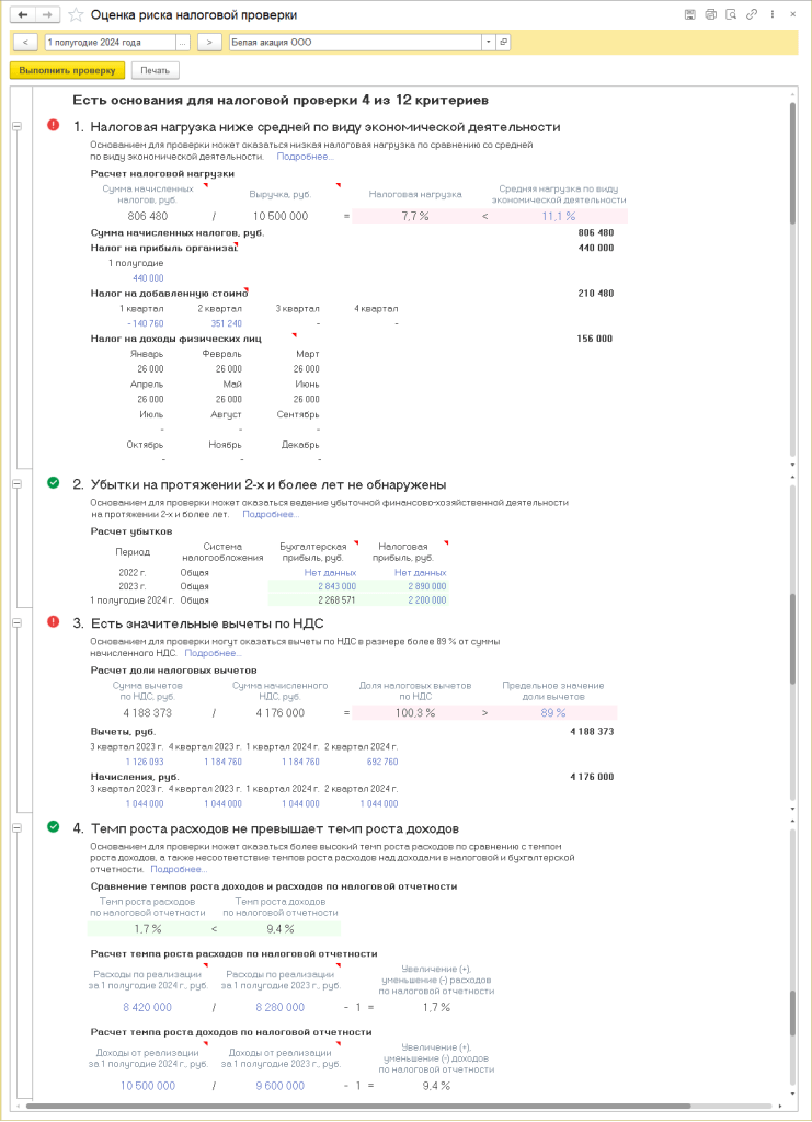 В «1С:Бухгалтерии 8» предусмотрен отчет Оценка риска налоговой проверки, который можно использовать для проверки имеющихся данных учета и регламентированной отчетности на соответствие указанным критериям (рис. 9).
