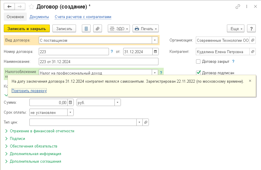 В программе «1С:Бухгалтерия 8» проверка статуса самозанятого контрагента выполняется на момент: