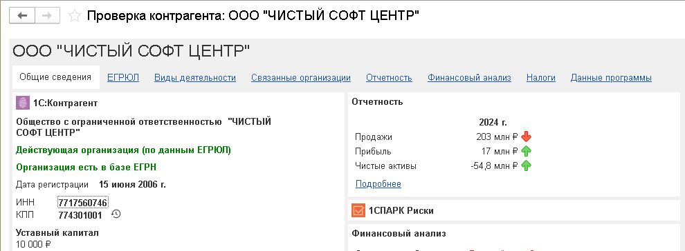 В отчете Проверка контрагента отражаются сведения из ЕГРЮЛ, связанные организации, бухгалтерская отчетность, финансовый анализ деятельности, информация о проверках госорганами, наличие лицензий, список подразделений (рис. 2).