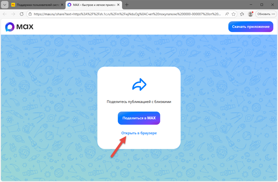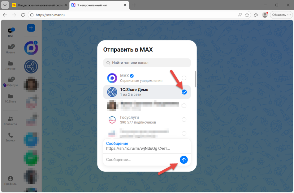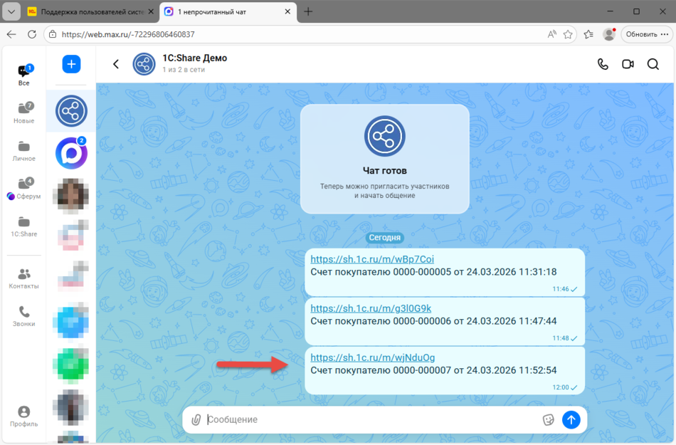 Даже в период нестабильной работы интернета для отправки счета, акта или накладной достаточно пары кликов. С помощью сервиса 1С:Share можно отправить ссылку на документ в мессенджер MAX прямо из вашей программы 1С.