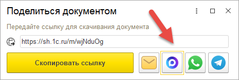 В форме списка документов или непосредственно в самом документе выберите команду Отправить – Ссылку на документ (в некоторых программах команда может называться Поделиться документом). После этого откроется форма со сформированной ссылкой сервиса 1С:Share.