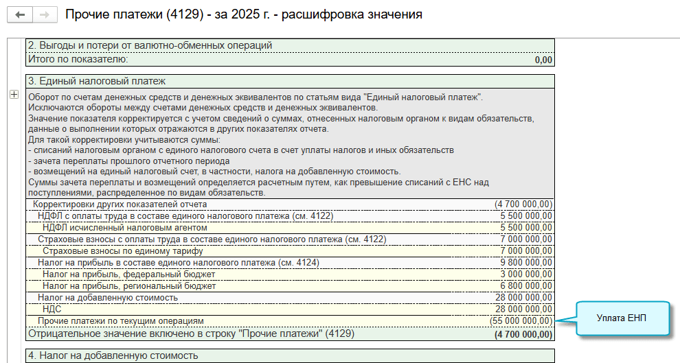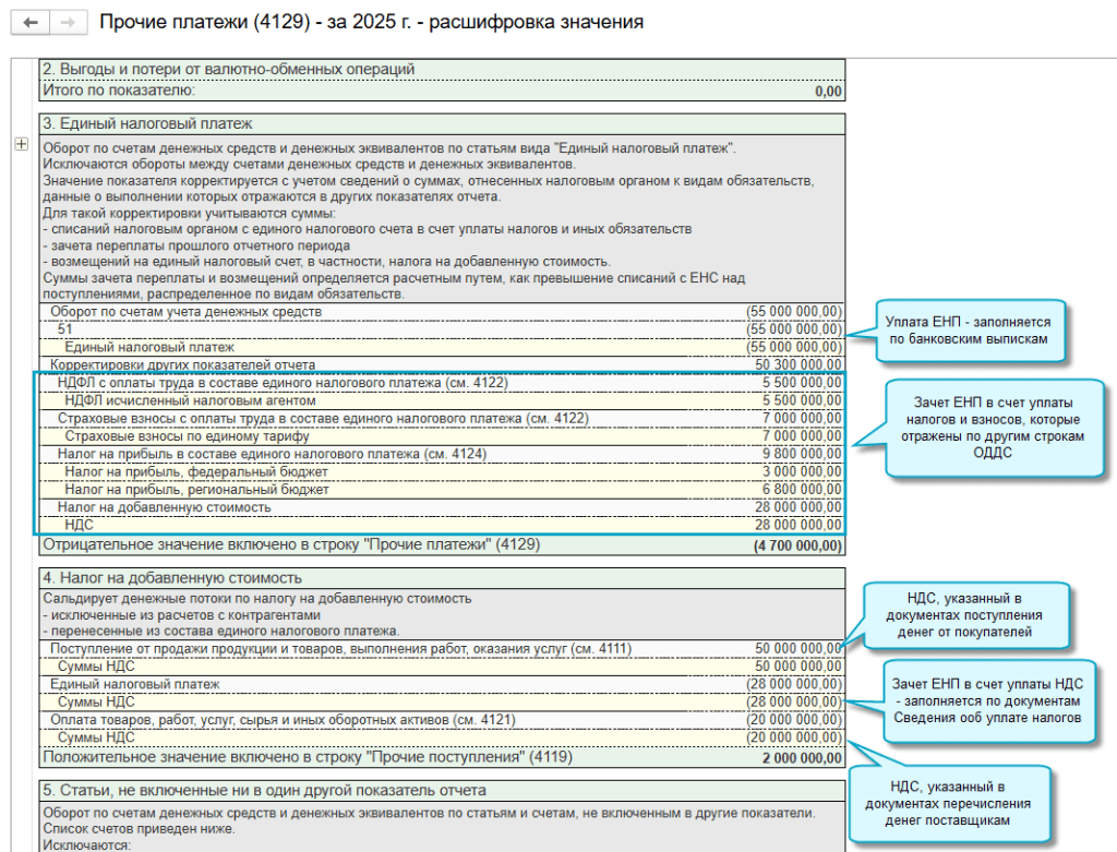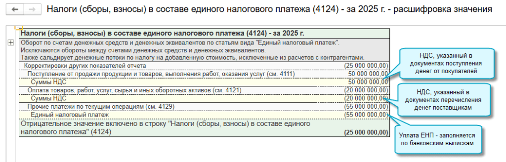 В отчете отражается общая сумма ЕНП и сальдо денежных потоков по НДС. Если сумма отрицательная, то она отражается в составе платежей по текущим операциям, а именно «налогов (сборов, взносов) в составе единого налогового платежа», если положительная – в составе прочих поступлений от текущих операций (код строки 4119).