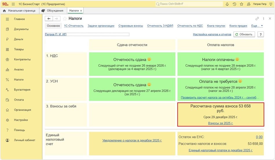 На вкладке Основное в блоке Взносы за себя перейдите по гиперссылке Взносы за 2025 г.