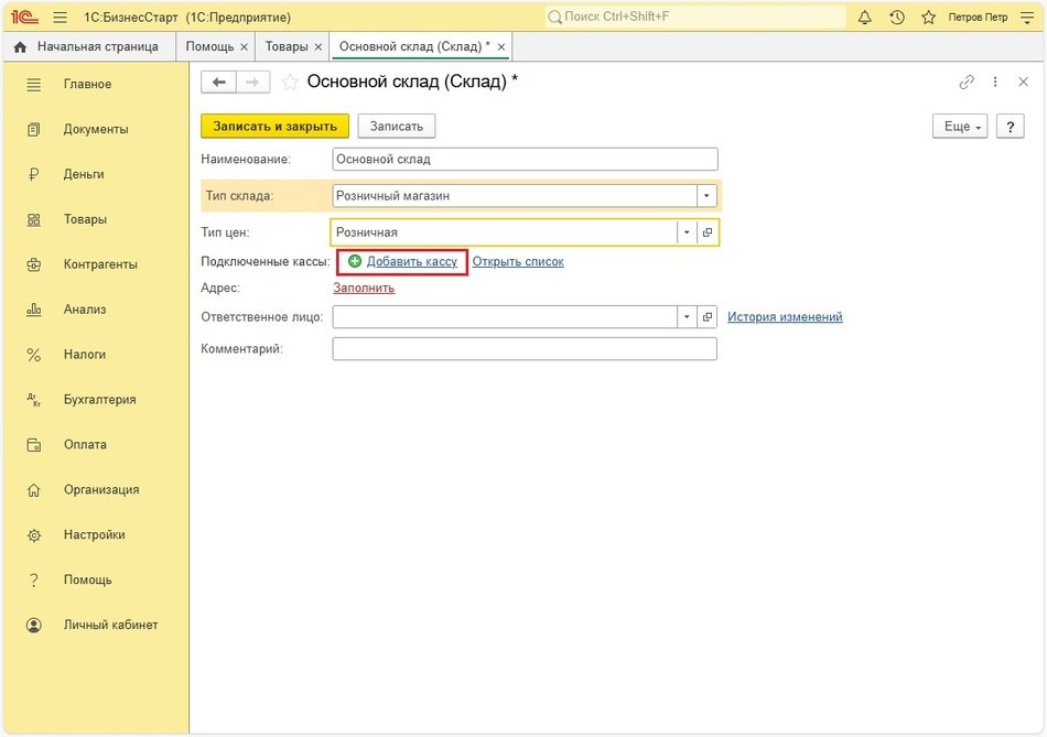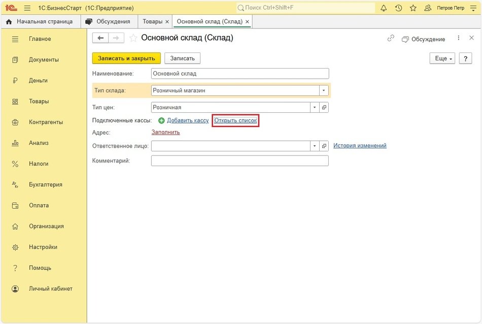 Откройте карточку склада. Перейдите по гиперссылке Добавить кассу.