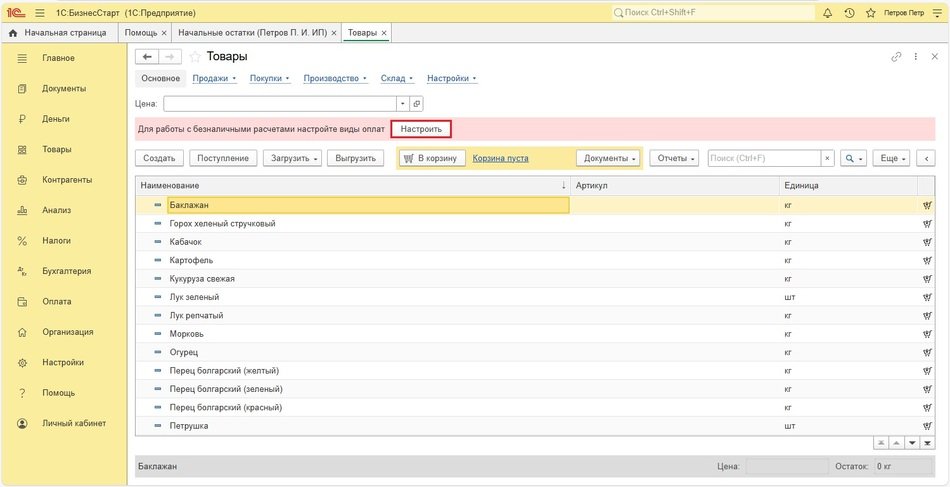 Откройте раздел Товары. На вкладке Основное отображается предложение настроить виды оплат.
