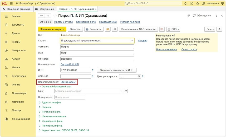 На вкладке Основное перейдите по гиперссылке в поле Налогообложение.