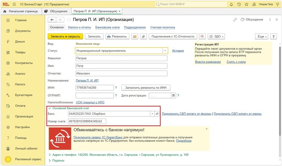 На вкладке Основное, в группе Основной банковский счет заполните данные банковского счета.