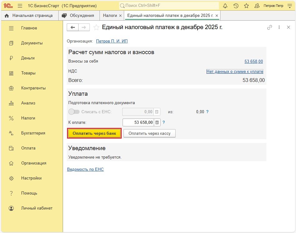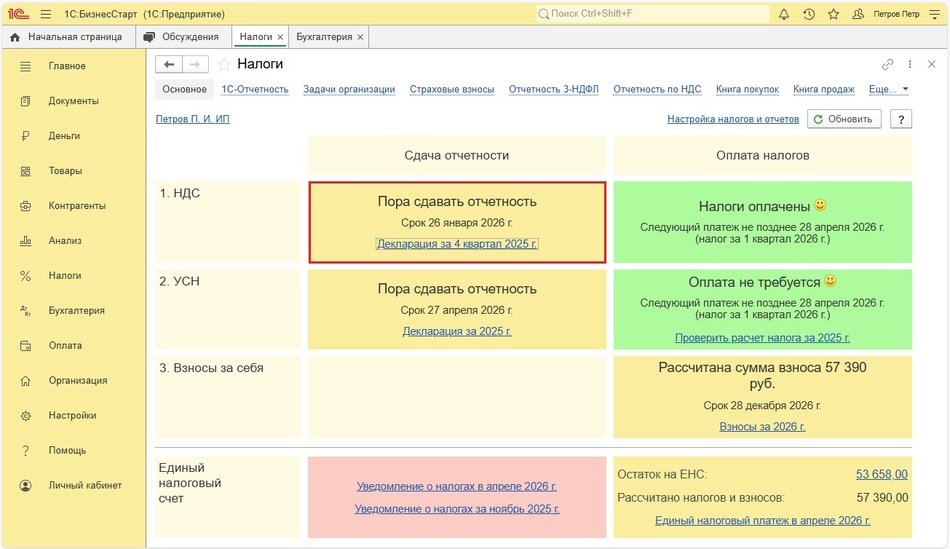 В разделе Налоги на вкладке Основное отображается, какую отчетность необходимо сдать и какие налоги оплатить. Переходите по гиперссылкам и следуйте подсказкам программы.