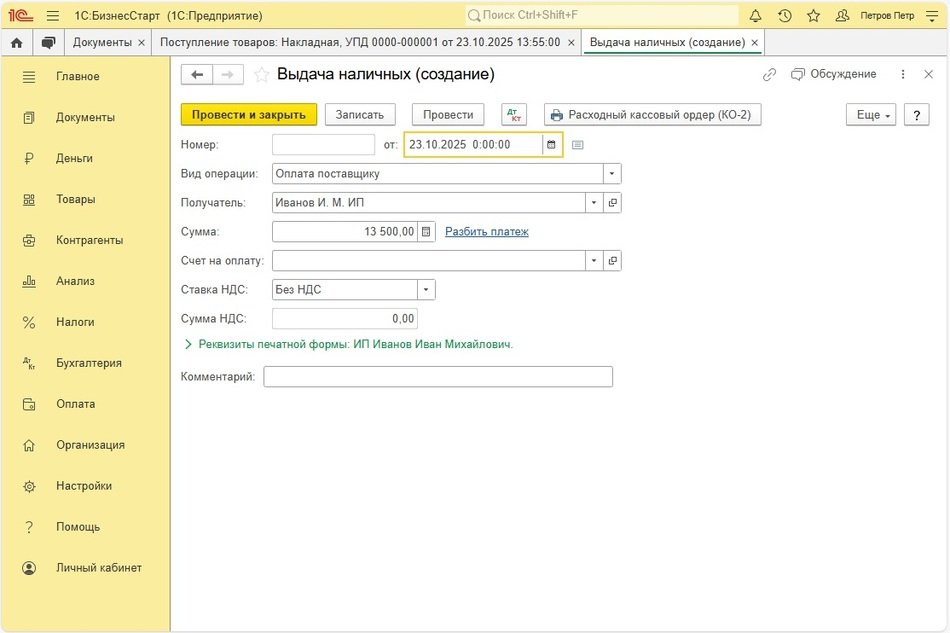Оплату товаров поставщику отразите документом Выдача наличных. Документ можно создавать на основании документа поступления по кнопке Создать на основании.