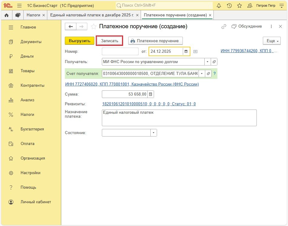 Откроется заполненный документ Платежное поручение. Нажмите кнопку Записать.