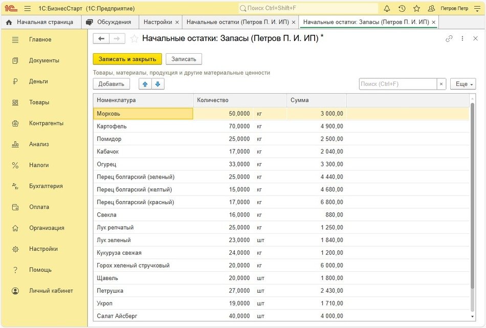 Заполните остатки. Нажмите кнопку Записать и закрыть.