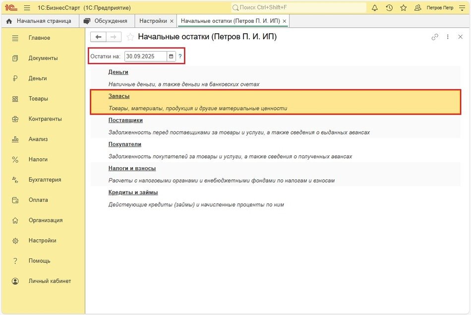 На форме ввода остатков установите дату. Перейдите в раздел Запасы.