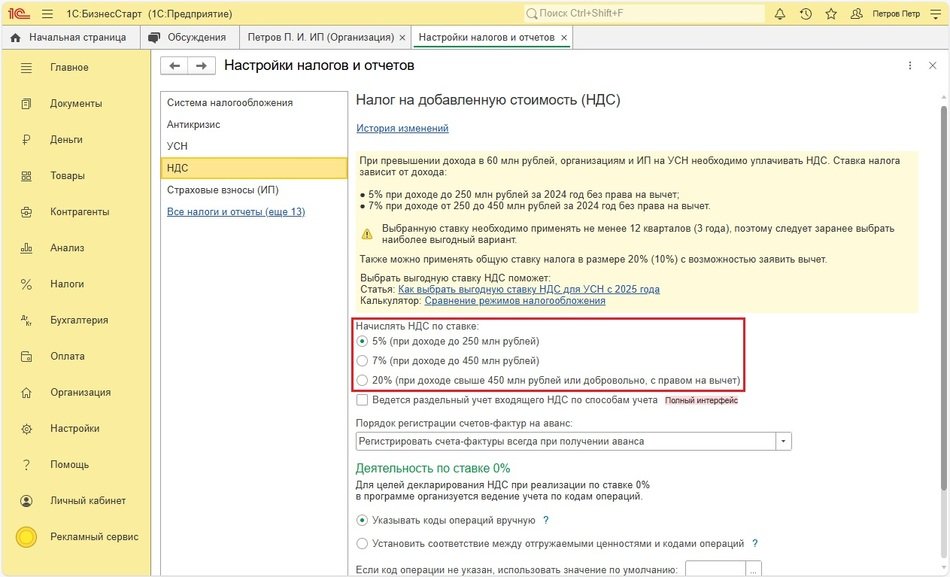 После применения изменений будет доступна вкладка НДС. Перейдите на вкладку и установите ставку НДС.