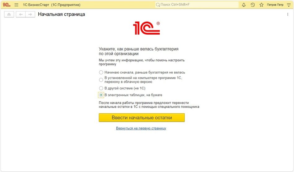 Выберите, где раньше велась бухгалтерия. Нажмите кнопку Ввести начальные остатки.