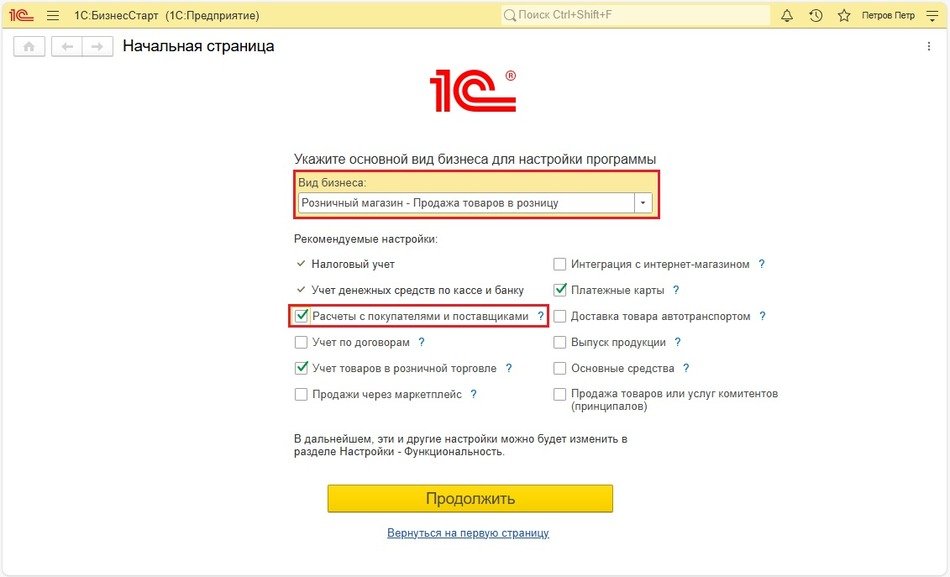 Выберите вид бизнеса – Розничный магазин. Установите флажок Расчеты с покупателями и поставщиками. Нажмите кнопку Продолжить.