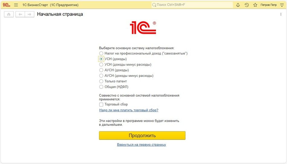 Выберите систему налогообложения. Нажмите кнопку Продолжить.