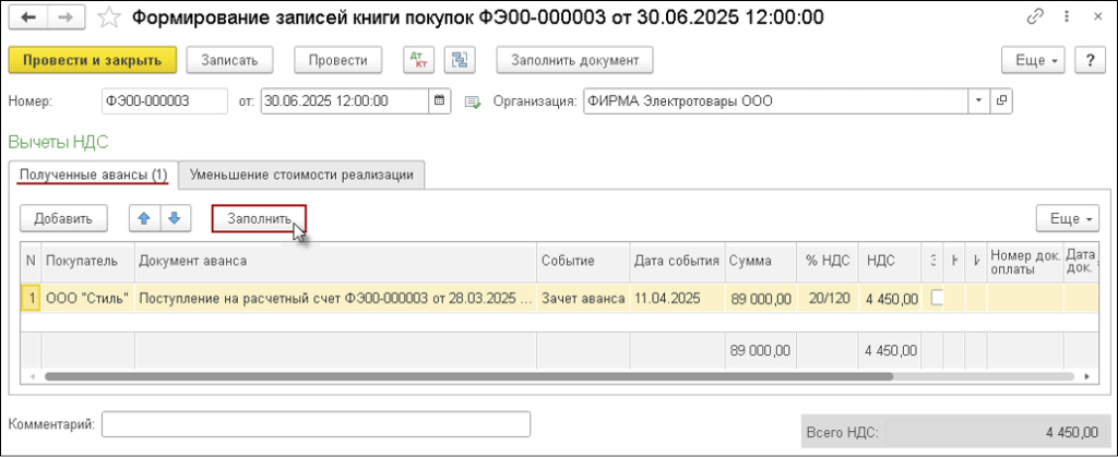 - на сумму НДС в размере 4 450, 00 руб. – в связи с зачетом полученной суммы предоплаты в счет оплаты отгруженных товаров (рис. 5);
