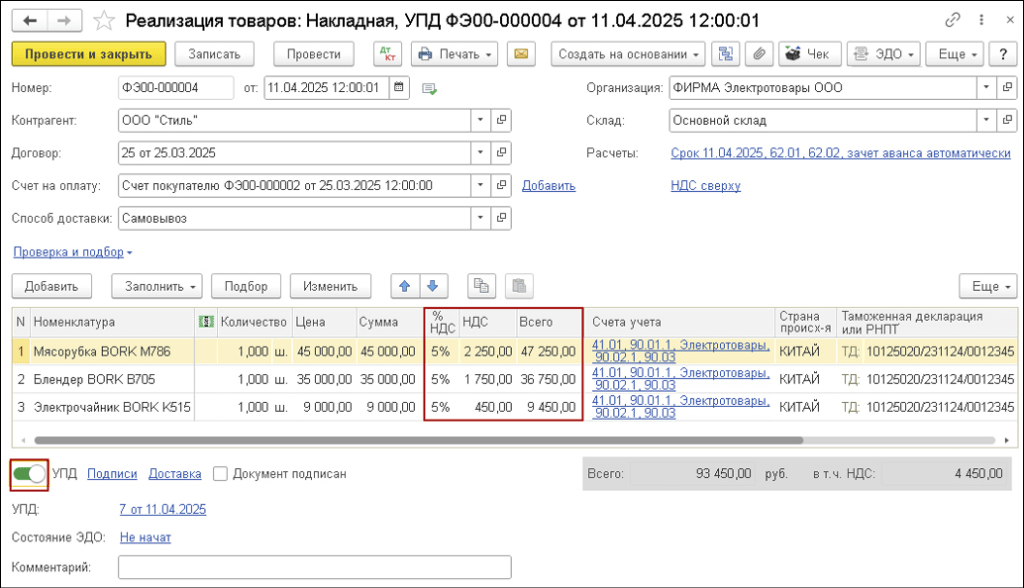 - 11.04.2025 реализовала товары на сумму 93 450,00 руб. (в т.ч. НДС 5% – 4 450,00 руб.): электрочайник BORK – 1 шт. по цене 9 450,00 руб. (в т.ч. НДС 5% – 450,00 руб.); блендер BORK – 1 шт. по цене 36 750,00 руб. (в т.ч. НДС 5% – 1 750,00 руб.); мясорубку BORK – 1 шт. по цене 47 250,00 руб. (в т.ч. НДС 5% – 2 250,00 руб.);