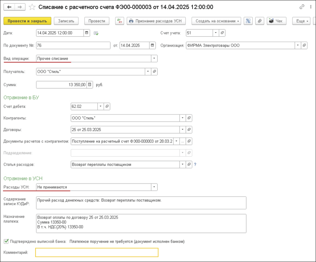 Рис. 6. Возврат переплаты покупателюПоскольку возвращаемая сумма переплаты представляет собой разницу между суммами НДС, исчисленными со стоимости отгруженных товаров по ставке 20% и ставке 5% (89 000,00 руб. х (20% – 5%)), и в силу этого не затрагивает расчеты по УСН, то предпочтительным представляется использование вида операции «Прочее списание», который позволяет установить, что данные расходы не принимаются в целях исчисления УСН.