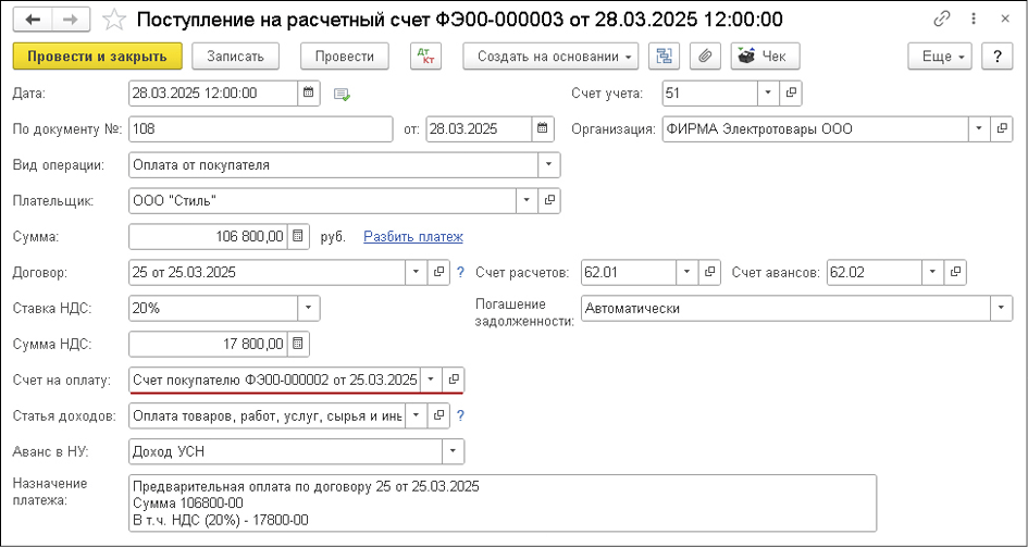 - 28.03.2025 получила предоплату в размере 106 800,00 руб. (в т.ч. НДС 20% – 17 800,00 руб.);