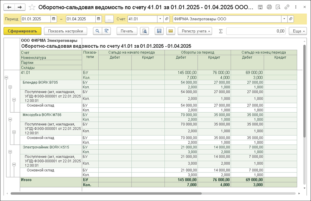 Следовательно, при переходе во II квартале 2025 года на применение ставки НДС 5% входной НДС по товарам (рис. 2), по которым ранее (в периоде приобретения – в I квартале 2025 года) был заявлен к вычету входной НДС и которые будут реализовываться с применением ставки 5%, необходимо восстановить. То есть в данном случае необходимо восстановить входной НДС в размере 13 800,00 руб. по следующим товарам: блендер BORK B705 (1 шт.) – 5 400,00 руб. (27 000,00 руб. х 20%); мясорубка BORK M786 (1 шт.) – 7 000,00 руб. (35 000,00 руб. х 20%); электрочайник BORK K515 (1 шт.) – 1 400,00 руб. (7 000,00 руб. х 20%).
