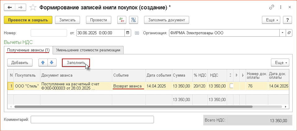 - на сумму НДС в размере 13 350,00 руб. – в связи с изменением условий договора и возвратом покупателю части излишне перечисленной предоплаты (см. рис. 7).
