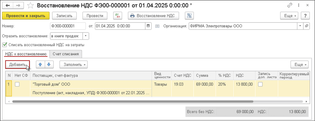 - на закладке НДС к восстановлению – наименование поставщика товаров, документ поступления, стоимость товаров, ставку и сумму входного НДС, ранее принятую к вычету (в данном случае – 13 800,00 руб.);