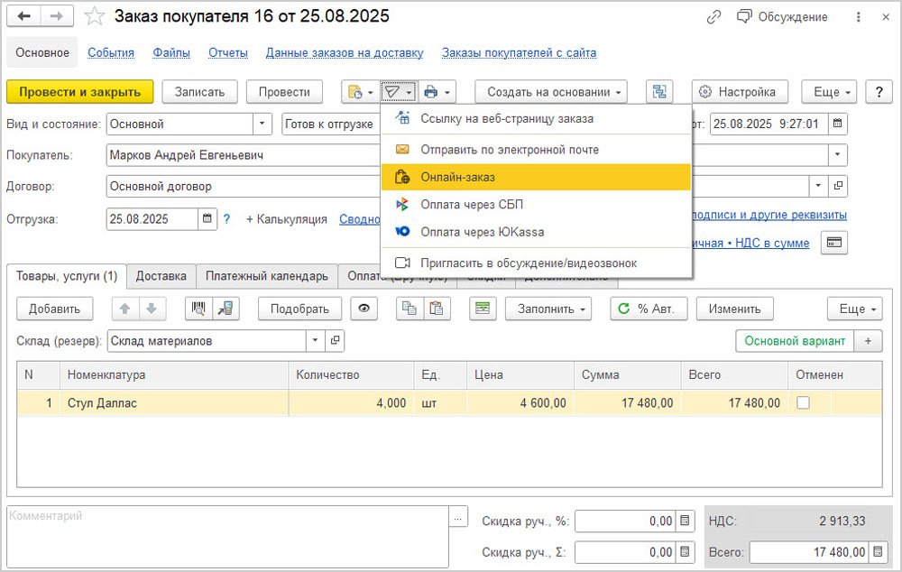 Сервис находится пока только в двух решениях 1С – «1С:Розница» и «1С:УНФ». При работе с документами «Заказ покупателя» и «Счет на оплату» менеджер выбирает «Онлайн-заказ», чтобы получить ссылку на счет с полной детализацией заказа.