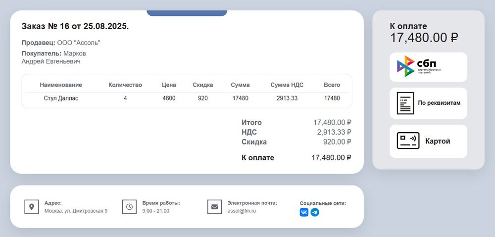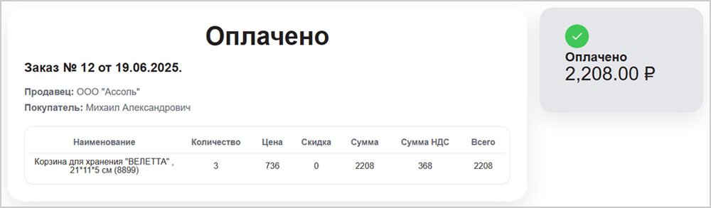 Если в документе есть ошибки, менеджер тут же их исправляет. При этом менять счет или заново выставлять его всякий раз, когда вносятся изменения, не приходится. Ссылка на онлайн-заказ содержит разные способы оплаты: СБП, банковской картой или с помощью QR-кода с реквизитами компании. Клиент сам выбирает наиболее удобный вариант и видит подтверждение оплаты после ее проведения.