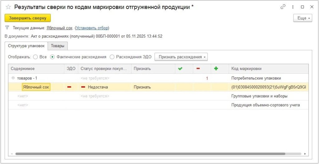 В созданном акте о расхождениях на закладке Товары предусмотрена колонка Расхождения по кодам маркировки. В ней отражаются выявленные покупателем излишки и недостачи по кодам. При этом расхождения по кодам маркировки могут быть и в случае, когда расхождения по количеству нет.