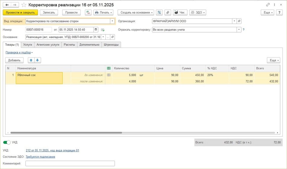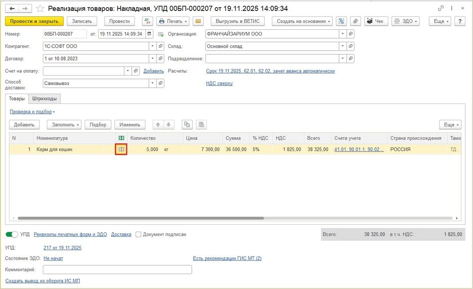 После проверки кодов маркировки проведите документ. Далее необходимо отправить документ покупателю по ЭДО. Сделать это можно по кнопке ЭДО. Информацию о кодах маркировки оператор ЭДО передает самостоятельно в ГИС МТ «Честный знак». После передачи данных коды маркировки переходят к новому собственнику.