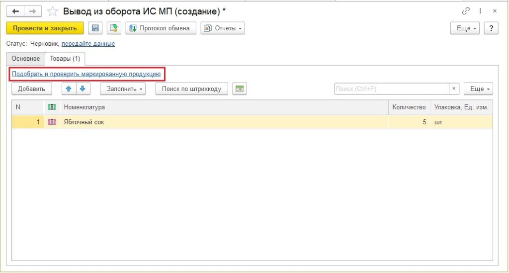 На закладке Товары указывается перечень товаров, выводимых из оборота. В форме подбора и проверки маркированной продукции необходимо отсканировать коды маркировки.