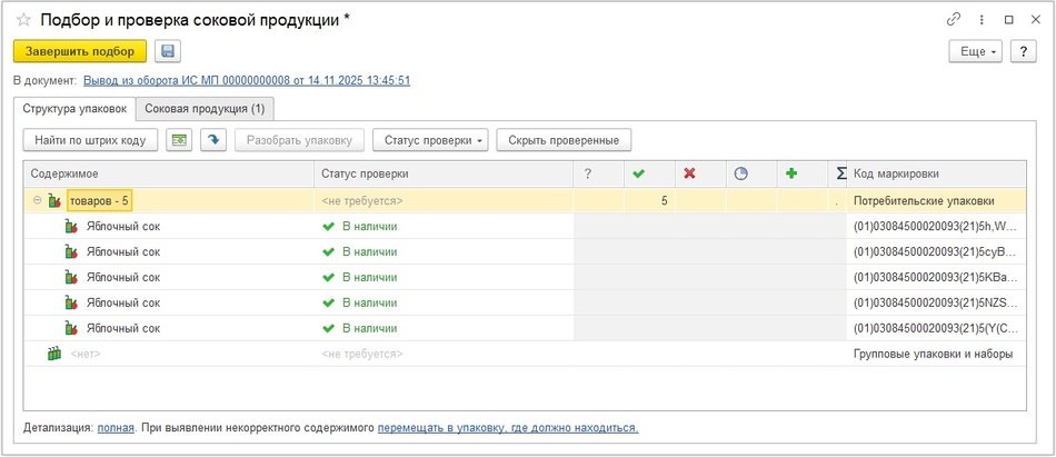 Рис. 3. Форма подбора и проверки маркированной продукции в документе «Вывод из оборота ИС МП»