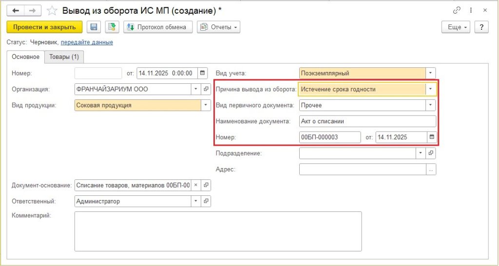 Документ предназначен только для отражения данных о выводе из оборота в Информационную систему маркировки и прослеживаемости (ИС МП) и не делает движений в складском и финансовом учете. Для отражения в учете должен быть оформлен Документ-основание, который можно указать в документе Вывод из оборота ИС МП. Вывод из оборота ИС МП находится в разделе Администрирование – Обмен с ИС МП (обувь, одежда, табак…).