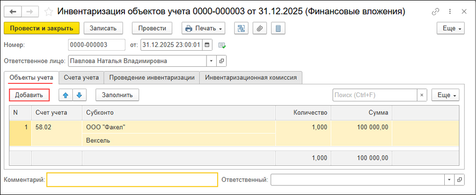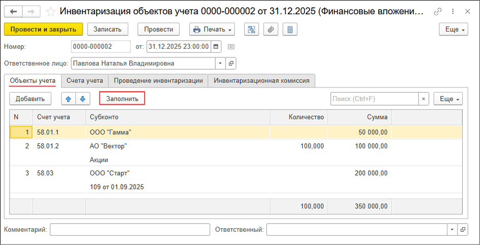 Проведение инвентаризации финансовых вложений (в части объектов, которые учтены в бухгалтерском учете) (операция 1.1) отражается документом Инвентаризация объектов учета с видом документа Финансовые вложения (раздел Операции – Инвентаризация – Инвентаризация объектов учета).