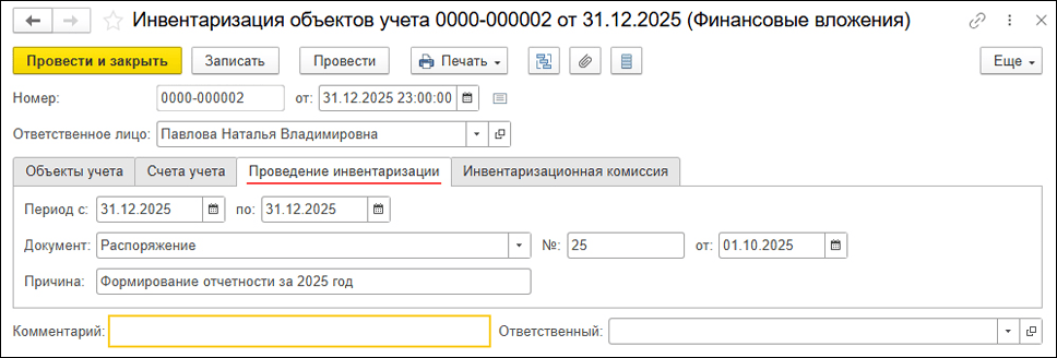 Для отражения результатов инвентаризации финансовых вложений используется документ Инвентаризация объектов учета с видом документа Финансовые вложения.