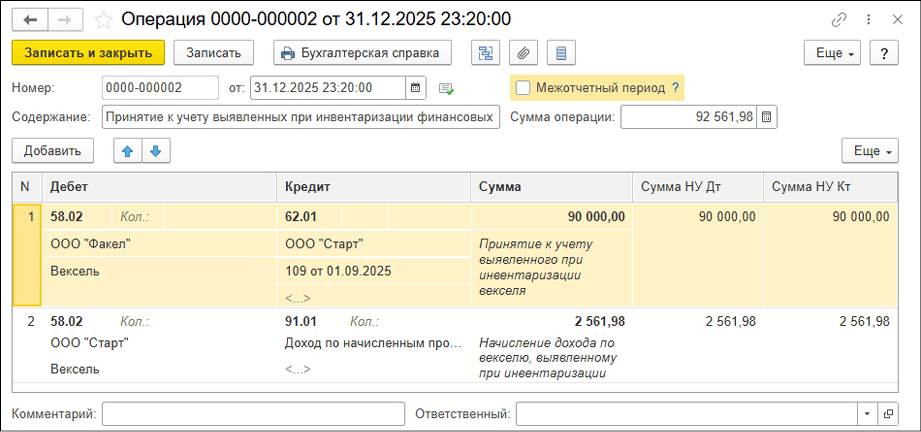 При инвентаризации выявлен не учтенный в бухгалтерском учете простой вексель ООО «Факел» номинальной стоимостью 100 000,00 руб., полученный от ООО «Старт» 30.11.2025 в рамках расчетов за оказанные услуги (стоимость услуг – 90 000,00 руб., в т. ч.НДС). Срок погашения векселя – 31.03.2026.