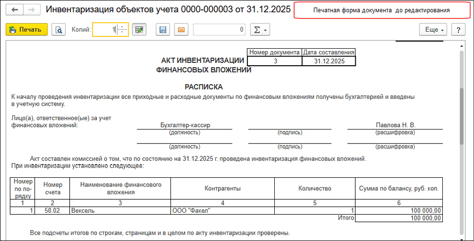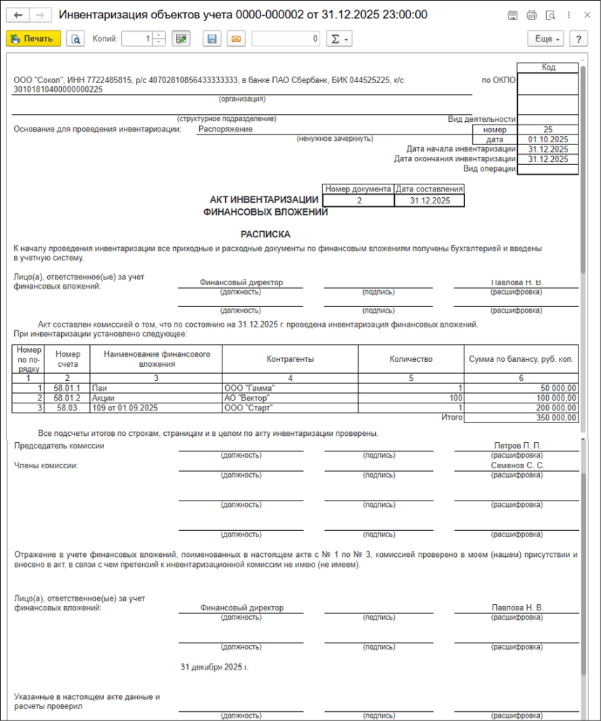 Обратите внимание, в колонках Количество и Сумма отразятся суммы безналичных денежных средств по данным бухгалтерского учета. Фактическое наличие денежных средств и отклонения можно будет указать в печатной форме акта инвентаризации при его редактировании вручную (см. далее). На финансовые вложения, которые не были учтены (например, были выявлены денежные средства в валюте, отличной от той, которая учитывается по данным бухгалтерского учета), согласно пункту 32 ФСБУ 28/2023, составляются отдельные документы инвентаризации (см. операцию 1.2).