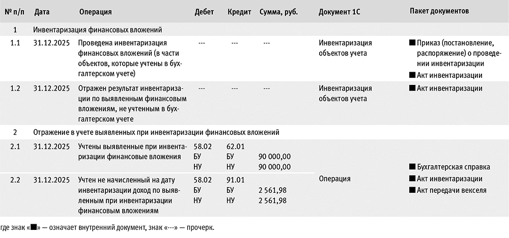 ООО «Сокол» перед составлением годовой бухгалтерской отчетности за 2025 год провела инвентаризацию финансовых вложений. Результаты инвентаризации оформлены по состоянию на 31.12.2025.