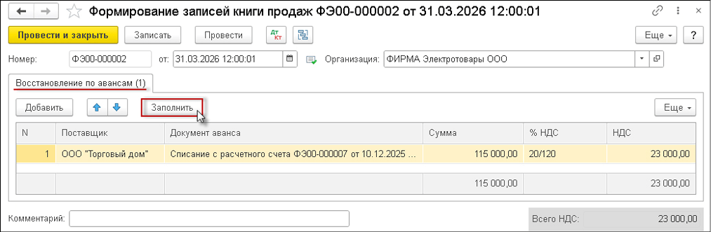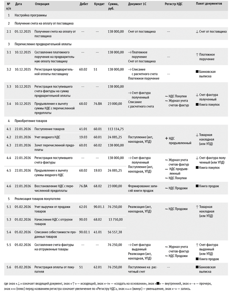 Также вносится запись в регистр накопления НДС Продажи для формирования книги продаж за I квартал 2026 года.