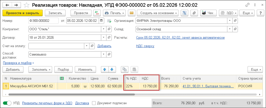 Если операция по отгрузке товаров оформляется с помощью документа об отгрузке товаров (выполнении работ), передаче имущественных прав (документа об оказании услуг), включающего в себя счет-фактуру, т.е.с помощью УПД со статусом «1» (счет-фактура и передаточный документ), то переключатель под табличной частью документа необходимо перевести в положение УПД.