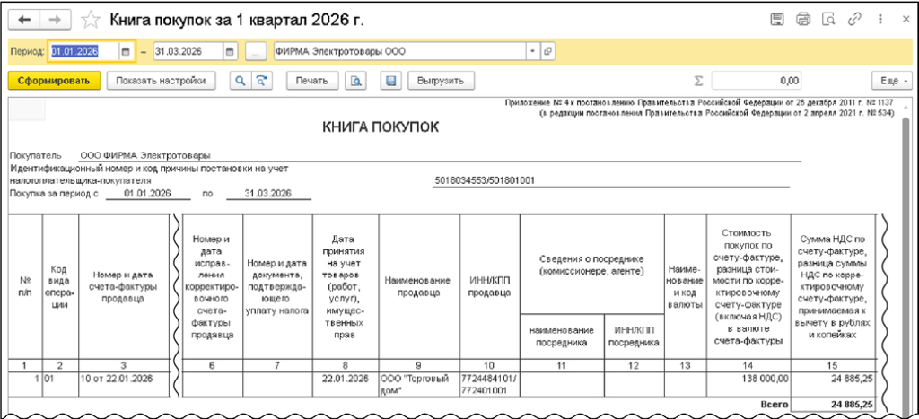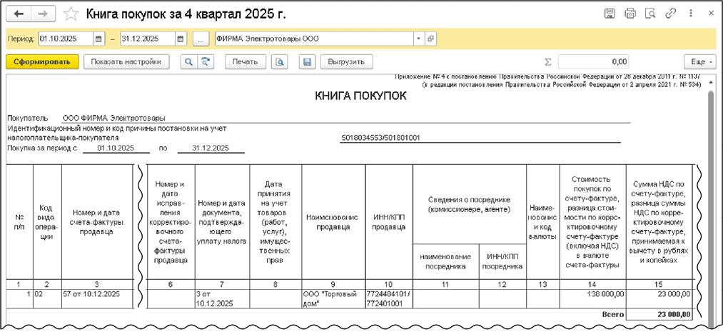 Рис. 2. Книга покупок за IV квартал 2025 года