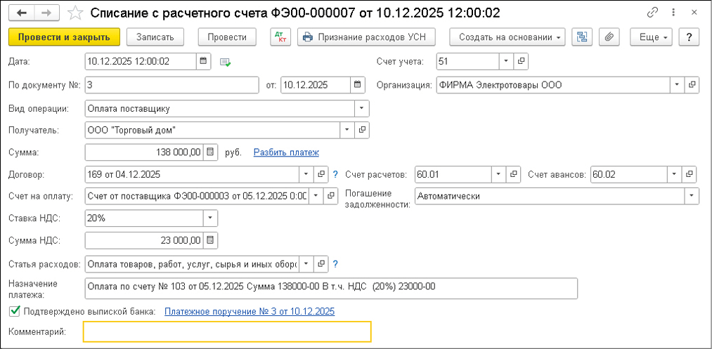- 10.12.2025 перечислил продавцу предварительную оплату в размере 138 000,00 руб. (в т.ч. НДС 20% – 23 000,00 руб.);