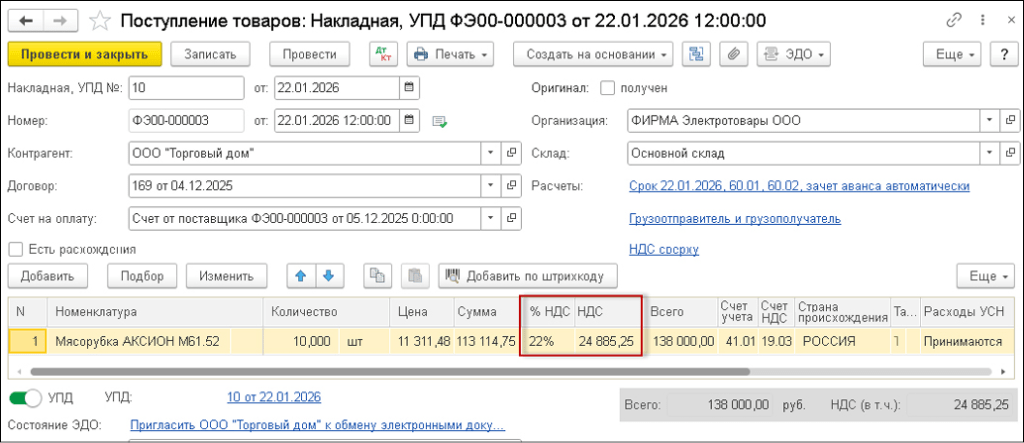 - 12.01.2026 в связи с переносом сроков поставки товаров на 2026 год заключил с продавцом дополнительное соглашение к договору, согласно которому стоимость товаров стала составлять 138 000,00 руб. (в т.ч. НДС 22% – 24 885,25 руб.);