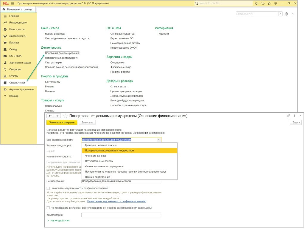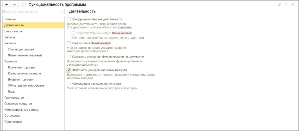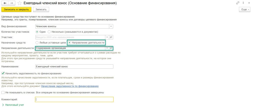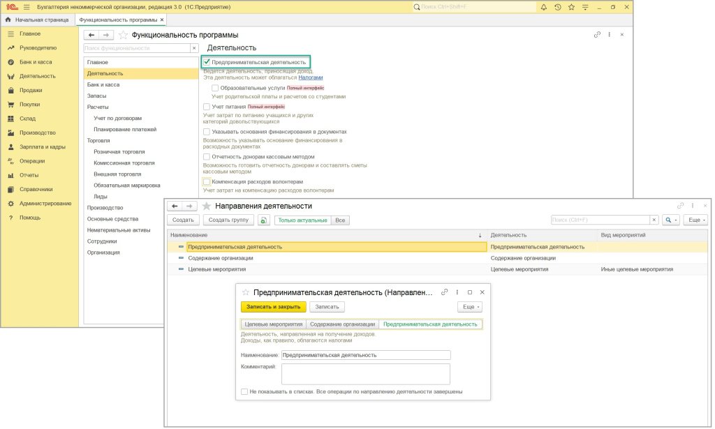 Направления деятельности имеют тип, всего их три: Целевые мероприятия, Содержание организации и Предпринимательская деятельность. Если организация осуществляет только некоммерческую деятельность, то вид Предпринимательская деятельность отсутствует. Возможность вести учет предпринимательской деятельности устанавливается в настройках (раздел Главное – Функциональность).